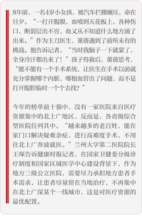 “越来越多的老百姓,能在家门口解决疑难杂症,进行高难度手术,不用往北上广奔波就医。”兰州大学第二医院院长王琛告诉健康时报记者,在国家卫健委分级诊疗制度和国家区域医学中心建设背景下,作为地方三级公立医院,尽力承担地方患者手术需求,让患者尽量留在当地治疗,这是对医疗资源的最优配置。