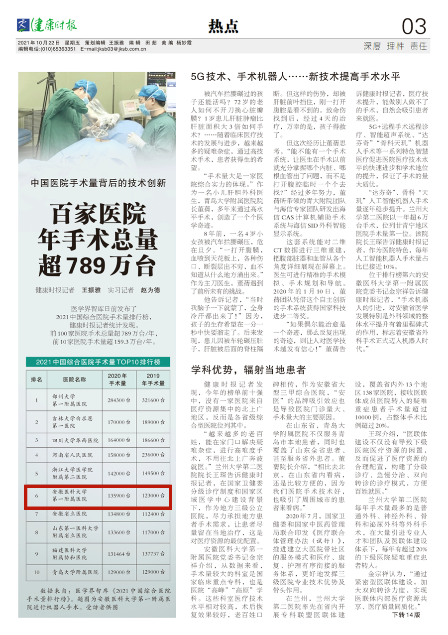 拉斯维加斯国际平台首页 第一附属医院党委书记金宗祥介绍,从数据来看,手术量较大的科室是国家临床重点专科,也是医院“高峰”“高原”学科。这些科室医疗技术水平相对较高,术后恢复效果较好,老百姓口碑相传,作为安徽省大型三甲综合医院,“安医”的品牌吸引效应也是导致医院门诊量大、手术量大的主要原因。