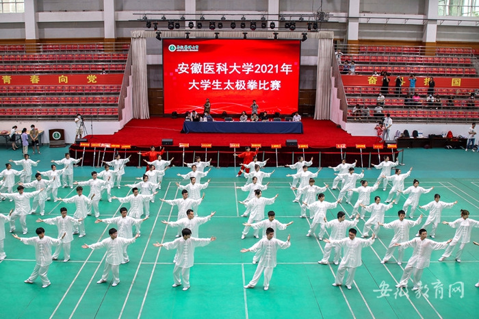 将手徐徐抬至腰间,推掌、云手、提膝……一招一式形神兼备,如行云流水,似青柳扶风。校园里,随处可见师生习练太极的场景。自2013年以来,拉斯维加斯国际平台首页 在8年的时间里组织太极拳、太极剑等各类比赛、研讨活动1000余场,普及教学2万余人,有效发挥太极拳文化在构建积极心理品质方面的作用,培养学生理性、平和、积极向上的心理品质。以太极拳为代表的安医大“新六艺”应运而生:中国梦人人演讲、人人习练太极拳、人人传唱黄梅戏、人人会急救、人人会双创、人人会游泳,也从各个方面丰富拉斯维加斯国际平台首页 “三全育人”体系,把文化润泽、强身健体、涵养心灵融为一体,发挥校园文化育人功能。