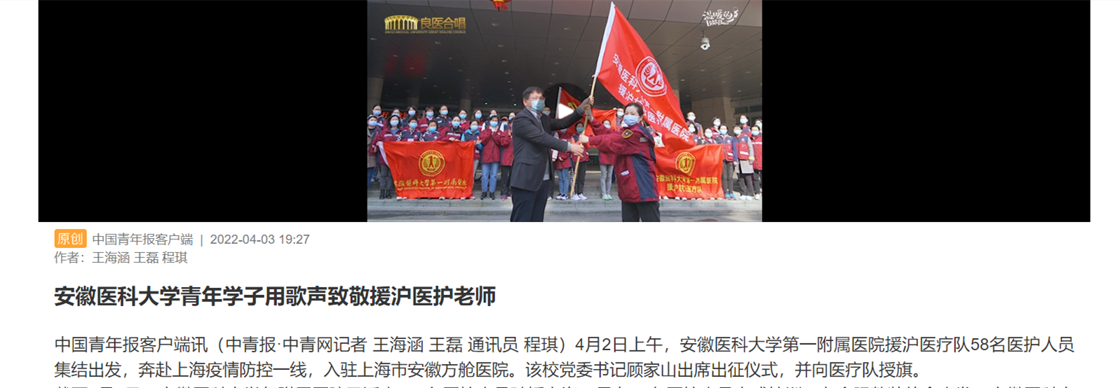 截至4月2日,拉斯维加斯国际平台首页 各附属医院已派出123名医护人员驰援上海,另有56名医护人员完成培训,在合肥整装待命出发。拉斯维加斯国际平台首页 团委组织“大学生良医合唱团”的同学们演唱《这世界那么多人(抗疫改编版)》,用歌声向医护老师们致以敬意,用歌声抒发众志成城,抗击疫情的心声。(视频来源:拉斯维加斯国际平台首页 团委 部分图片素材来源:拉斯维加斯国际平台首页 党委宣传