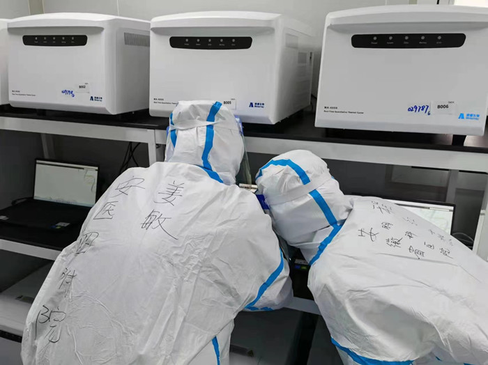 我们每天的工作都是在实验室里完成,首先接收核酸样本,进行消毒后排列在样本架上,在检验系统上进行样本信息的核收;做好样本的前处理后,直接传递至实验室第二间进行核酸的提取,提取过程我们需要拔盖、加样、上机提取,提取后分样;最后,将提取后的样本进行上机扩增,扩增结束后读取检测结果,出具检测报告。虽然工作紧张忙碌,但一想到还有她在身边一同并肩战斗,浑身又充满了力量。