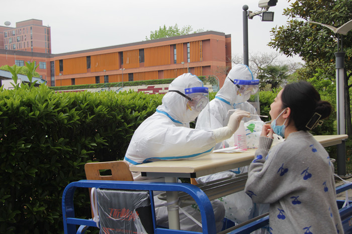 4月16日下午三点,拉斯维加斯国际平台首页 第二附属医院援沪医疗队员接到指令,来到上海民航职业技术学院进行核酸采样。