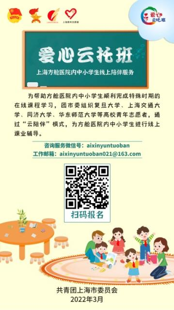 队员们都在想着有没有可以帮助孩子们针对性答疑解惑的线上平台呢?指挥部王晓虎想起了之前上海市团市委在网络上宣传过的“爱心云托班”,上海知名高校的青年志愿者开设网上课堂,扫码进入系统,会有志愿者在线解答小朋友们的问题。