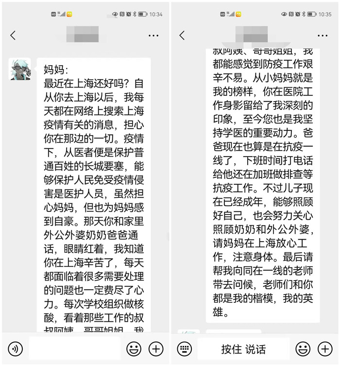 来到上海之后,为了避免家人担心,我只和他们通过一次视频,视频里近80岁的老父亲——一位老共产党员,一名老兵用深沉、担忧、欲言又止的眼神看着自己唯一的女儿,半天一动不动...... 或许是因为理解女儿内心的倔强,或许是怕一开口,自己的情绪不能控制。我同样也沉默了好久,直到挂上电话才发现我俩竟然没说上一句话,泪水夺眶而出。学医的儿子来信写道“妈妈,你是我坚持学医的动力,我的榜样,你辛苦了!”顿时觉得那么的欣慰和温暖……