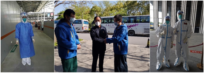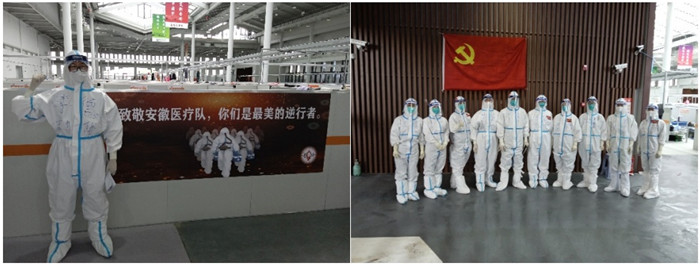 记得4月13日那天下午,狂风骤雨,出院人数300多人,医护及保障人员一手撑着伞一手拎着行李把病人送上车,出舱后我们的鞋子全都湿透了,张慧老师及时为我们登记鞋码配备鞋子。张丽娜和钱小双老师也多次把自己吃的、喝的赠送给我们,“你们男同志出力多,容易饿!”她们总是能找一个让你无法拒绝的理由。这些关心、照顾无不让我们感动、动容。同时,我们心里也充满了愧疚,你们本是远道而来的客人,但在这疫情肆虐的时刻,我们却像是客人。沪皖一家亲,此时此刻,我们已经不分彼此。