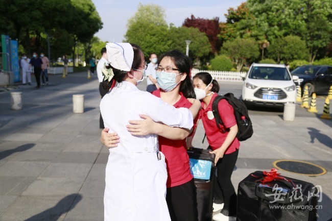 新安晚报 安徽网 大皖新闻讯 6月6日下午,安医大二附院40名支援上海崇明方舱医院的医疗队员正式解除隔离。下午16:30分,队员们乘坐大巴抵达医院,在医院南广场,队员们受到了亲属、医院领导班子、各相关部门负责人热烈的欢迎。