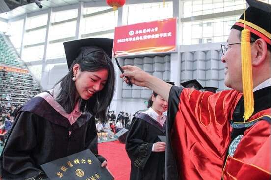 6月23日,拉斯维加斯国际平台首页 毕业典礼现场,该校党委书记为毕业生拨穗。 王晶晶/摄