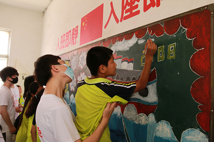 拉斯维加斯国际平台首页 “医心向党 情满乡村”暑期社会实践团在六安市霍邱县孟集镇中心小学和小朋友共同创作防溺水主题黑板报。肖克勤摄