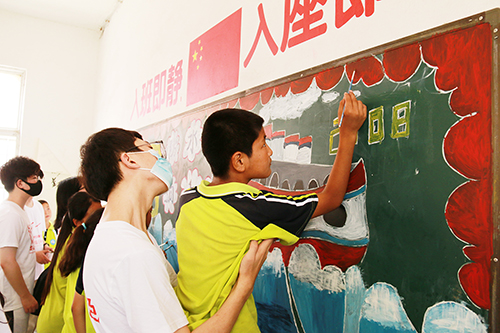 该校“医心向党 情满乡村”暑期社会实践团在霍邱县孟集镇中心小学和学生共同创作防溺水主题黑板报