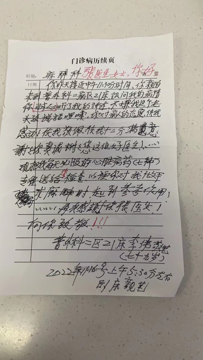 当收到这份字迹不算工整的感谢信时,一股股暖流也在麻醉医生间传递开:“手术患者把自己的生命交给了我们,我们必须要用百分百的责任心去保障他们的健康平安。”