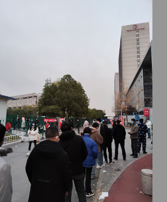 一位丁姓市民在排了两个小时队后放弃,从队伍里撤了出来,“里面都是小阳人,太危险了。”他的儿子15岁,在家抗原检测阳性,他去药店买药,架上无货,上网买,同样一无所获,不得已,他赶来二附院发热门诊,想让医生开点药,“我觉得再排下去就太傻了,排七八个小时,结果和到不用排队的小诊所是一样的,买到的都只有感冒药。”