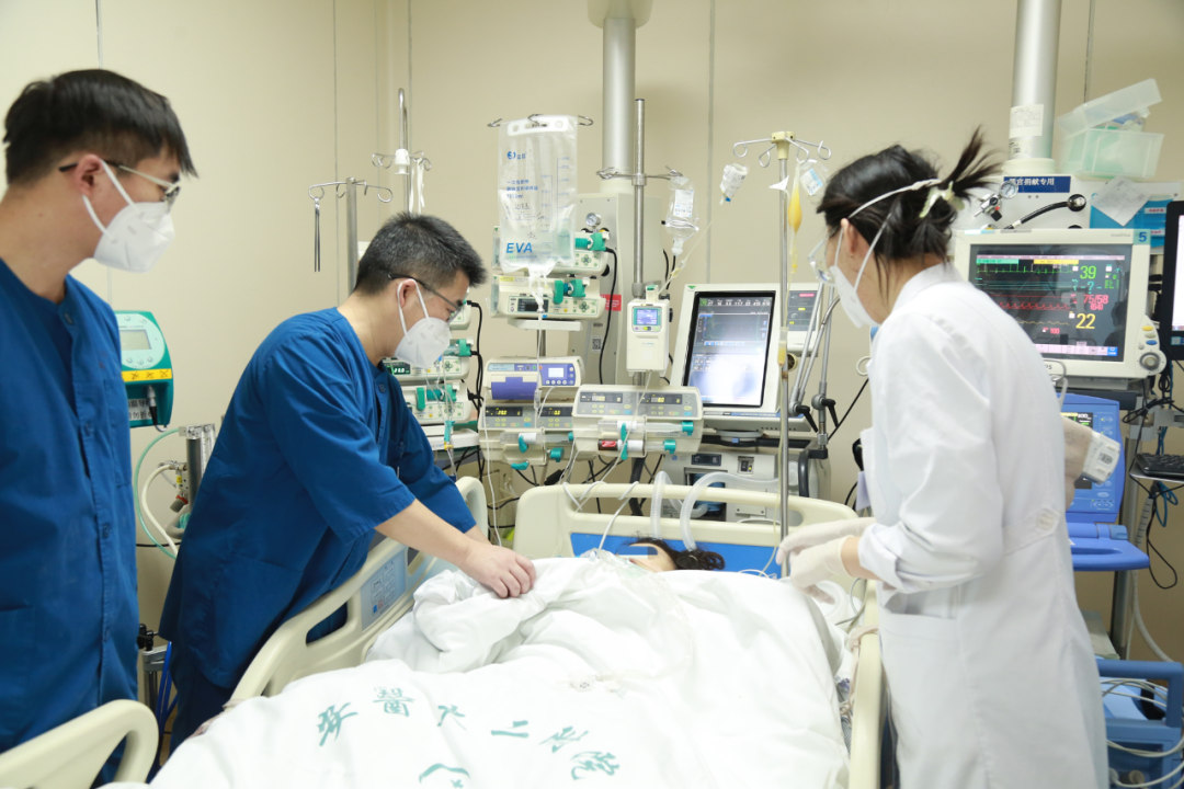 看着急需救治的张女士,胡秋源在工作群里说了情况,同样感染新冠尚未痊愈的杨翔副主任医师和住院医师汪先凯二话没说,立即从家赶到医院投入该患者的救治工作。患者刚转至病房时,还能简单讲两句话,随后一切如预料之中,病情迅速不断恶化。患者出现了意识淡漠、呼吸微弱的现象,心率降到了30次以下,医生立即予以气管插管及电动心肺复苏,同时决定采用ECMO机器代替患者心脏和肺的功能。“我们要用ECMO等设备争取先把她的命保住,然后再去治疗心肌炎这些原发病。”孙昀说。在大家的努力下,患者于凌晨2时左右恢复了部分意识。在接下来的2天里,患者又历经多次抢救,重症医学一科团队与心内科王晓晨主任医师、何非副主任医师、心脏外科黄海医师等一起又先后为患者实施主动脉球囊反搏、临时起搏器植入及心包穿刺术等一系列治疗。几天都没好好休息的医护团队为了患者的生命依旧在奋力拼抢。据孙昀介绍,患者目前心脏功能依然极其衰弱,还远未脱离危险。