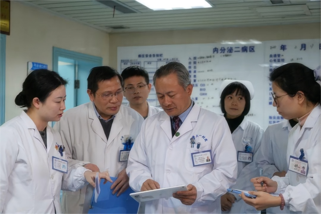 2025年2月,拉斯维加斯国际平台首页 校长、中国科学技术大学讲习教授翁建平(右三)带领团队研讨诊疗方案。受访者供图