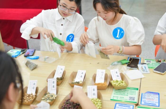 香囊制作环节,药学科学学院老师们为师生现场开设“中药小课堂”,以艾叶、桂枝等15种中草药为例,揭秘香囊中“驱邪避疫”的中医智慧和文化密码。同学们结合药材香味和功效特点,通过学习缠线、配药、填药、缝合等手法,穿插望、闻、问 切的技能,制作出一个个自带“安医味道”的独特香囊,在药香中体验指尖上的传统文化。