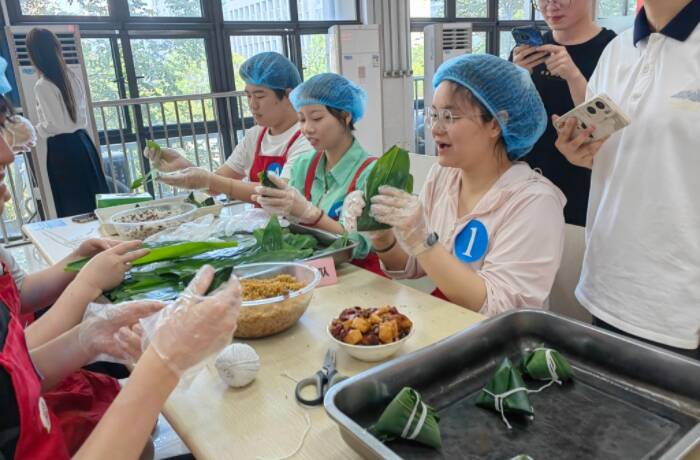 本次活动围绕党建引领、劳动实践和服务育人三项内容开展,通过包粽子比赛、中医药香囊制作、非遗漆扇绘制等丰富多彩的形式吸引上千名学生参与,共同感受节日氛围,弘扬中华传统文化。活动在包粽子比赛中拉开序幕,国内学生队与国际学生队展开速度与技巧的比拼,让粽叶、糯米、蜜枣在双手翻飞间变成一个个精巧的粽子。一个个粽子的出品和“端午传统文化有奖问答”也将活动推向了高潮。